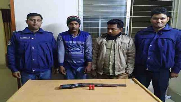 কাঞ্চনপুর গ্রামের বুলু শেখের বাড়ির সামনের পাকা রাস্তা থেকে তাদের আটক করে। আটককৃতরা হলেন- পুরুলিয়া গ্রামের জান্নাত সরদারের ছেলে নয়ন সরদার (৩০) ও মিনারুল শেখের ছেলে জাহিদুল শেখকে (২৮)। কালিয়া থানার ওসি মো. রফিকুল ইসলাম জানান, গোপন সংবাদের ভিত্তিতে অভিযান চালিয়ে ওই দুই যুবককে আটক করা হয়। এসময় তাদের কাছ থেকে একটি দেশী তৈরি বন্দুক ও দুই রাউন্ড গুলি উদ্ধার করা হয়। এছাড়া একটি মোটর সাইকেলও জব্দ করা হয়।