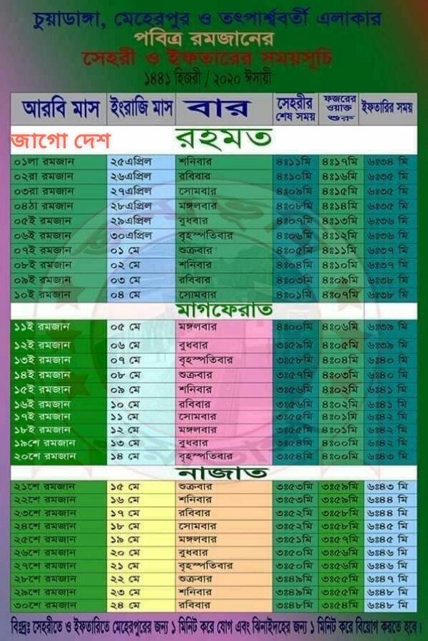 সেহেরীর শেষ সময় ভোর ৩টা ৫৬ মিনিট। ফজরের ওয়াক্ত শুরু ৩ টা ৫৬ মিনিট।